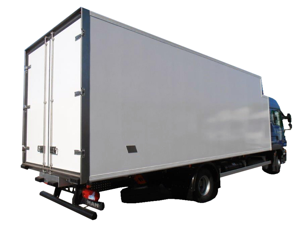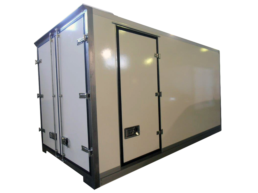 Der isothermische Bodykit besteht aus isolierten Platten mit 40/60 mm Stärke Vorderwand (Verstärkung für Kühlaggregat), Seitenwände, Dach, Heckrahmen aus Edelstahl mit Doppelflügeltür und Edelstahl-Scharnieren sowie innen- oder aussenliegenden Drehstangenverschlüssen.
