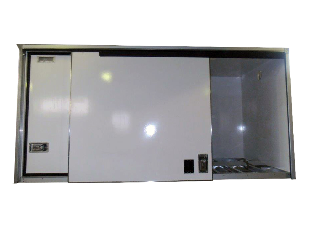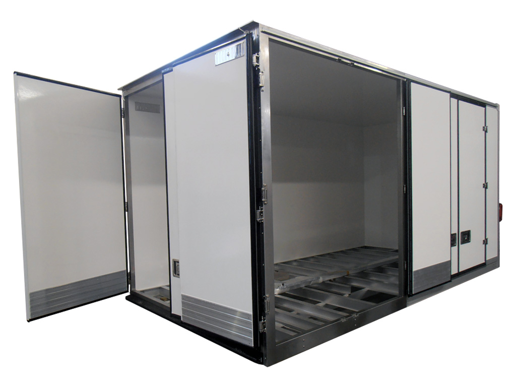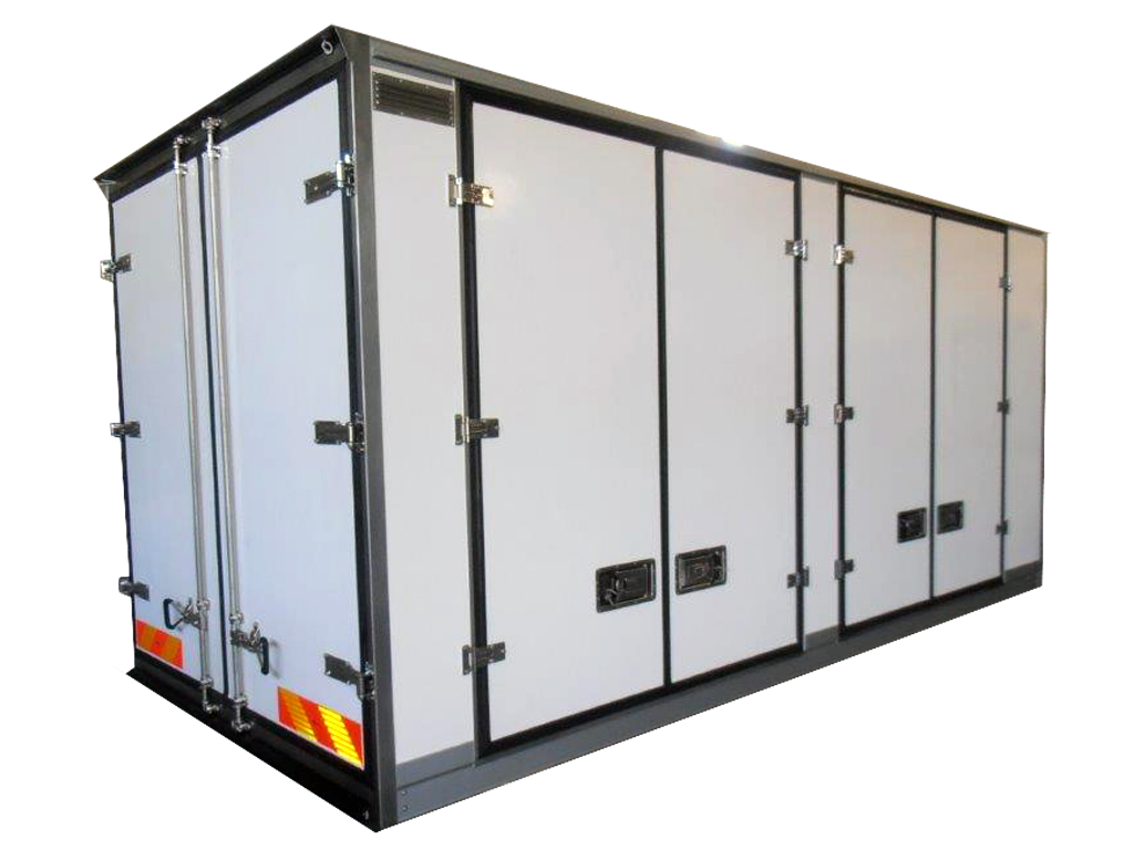 Der isothermische Bodykit besteht aus isolierten Platten mit 40 mm Stärke Vorderwand (Verstärkung für Kühlaggregat), Seitenwände, Dach, Heckrahmen aus Edelstahl mit Doppelflügeltür und Edelstahl-Scharnieren sowie innen- oder aussenliegenden Drehstangenverschlüssen.